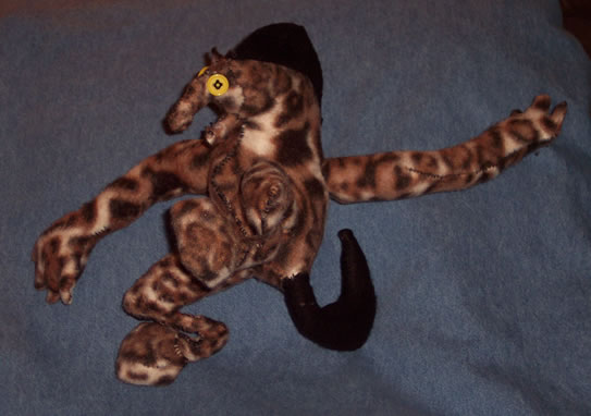 I like the body and especially the legs, but the head is a little off. I will probably fix the head and do something different there. I also am considering a frayed head crest, so it looks like fur. I tried to get fur, but had some logistical problems there. The special feature of this plush is the accesories. It has pants and gloves (not shown)!